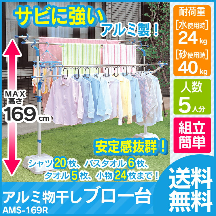 ●商品サイズ(約):幅80×奥行31.5×高さ119.5〜169cm ●重量:2.07kg(1台あたり) ●干す量の目安:シャツ等20枚、バスタオル6枚、タオル5枚、小物24枚 ●耐荷重(土台重量1つあたり15kg以上(砂使用)時):全体40Kg、竿1本あたり10Kg ●材質:アルミニウム、ポリプロピレン、ABS樹脂、ポリエチレン★