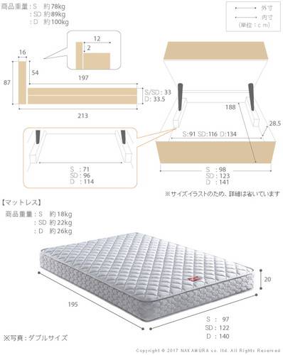 ●メーカー2年保証【セット構成】ベッドx1、マットレスx1【バリエーション】ダークブラウン・ミディアムブラウン・ナチュラル【仕様】■ベッド本体・床板:プリント紙化粧合板跳ね上げ収納:ガススプリングコンセント:1口1500Wコード長さ:約1.7m照明:LED◎組立品■マットレス張地:ポリエステル44%、綿28%、レーヨン28%コイル:高密度連続スプリング【サイズ】■ベッド幅123x奥行213x高さ87cm/約89kg宮奥行:16cm収納:幅116/96x奥行188x高さ28.5cm■マットレス幅122x奥行195x高さ20cm/約22kg