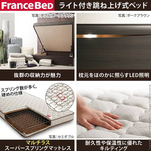 ●メーカー2年保証【セット構成】ベッドx1・マットレスx1ダークブラウン・ミディアムブラウン・ナチュラル【仕様】■ベッド本体・床板:プリント紙化粧合板跳ね上げ収納:ガススプリングコンセント:1口1500Wコード長さ:約1.7m照明:LED0.2W◎組立品■マットレス張地:ポリエステル64%、綿27%、レーヨン9%中身:ウレタンフォーム、パームパッド、ポリエステル綿、防虫不織布コイル:マルチラススーパースプリング【サイズ】■ベッド外寸:幅123x奥行213x高さ87cm/重量:約89kg床面高さ:33cm床面サイズ:幅123x奥行197cm宮奥行:16cm宮上有効サイズ:幅122.5x奥行12cm跳ね上げ収納サイズ:幅116/96x奥行188x高さ28.5cm■マットレス外寸:幅122x奥行195x高さ16cm/重量:約20kg